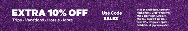 | | | Water-Park Passes and Game Card at Ohio Resort | | Sandusky, OH — Kalahari Resorts & Conventions Sandusky | A stay at this kid-friendly resort in Ohio includes passes to its indoor water park—one of the largest in the country—and a $50 game card | | | | | | | | | | | | | | | Lake Geneva Water-Park Resort | | Lake Geneva, WI — Timber Ridge Lodge & Waterpark | Family-friendly Lake Geneva water-park resort with spacious suites and seasonal attractions such as family magic shows | | | | | | | | | 4-Star Boutique Hotel in Times Square | | New York, NY — Paramount Hotel | This recently renovated 4-star 1920s hotel has modern decor and original artwork; steps from Broadway theaters in Times Square | | | | | | | | | Lakeside Indiana Resort | | Syracuse, IN — Oakwood Resort | Lakefront resort in northern Indiana with a restaurant, bar, and massage services; within a 2.5-hour drive of Chicago and Indianapolis | | | | | | | | | ✈ 7-Day Azores Vacation with Air from Gate 1 Travel | | Ponta Delgada — ✈ 7-Day Azores Vacation with Hotels and Air from Gate 1 Travel | Explore cobblestone streets and green hillsides on this 7-day vacation in the Azores, an island chain 1,000 miles west of Portugal | | | | | | | | | Resort in Ohio Amish Country | | Berlin, OH — Berlin Resort | This family-friendly resort in Ohio’s Amish Country has a private movie theater and an indoor pool and sauna | | | | | | | | | More Getaways This Week |  | | 4-Star Lake Geneva Resort | |  | | Peru Tour with Air | | | | |  | | Romance Package at Michigan B&B | |  | | Great Smoky Mountains Cabins | | | | | | | | | | Need help? Have feedback? Feel free to contact us. | | | | | Extra 10% Off Your Next Getaway | Ohio Water-Park Resort w/ Games | Boutique Hollywood Hotel | Four Diamond Inn in Geneva, IL | |